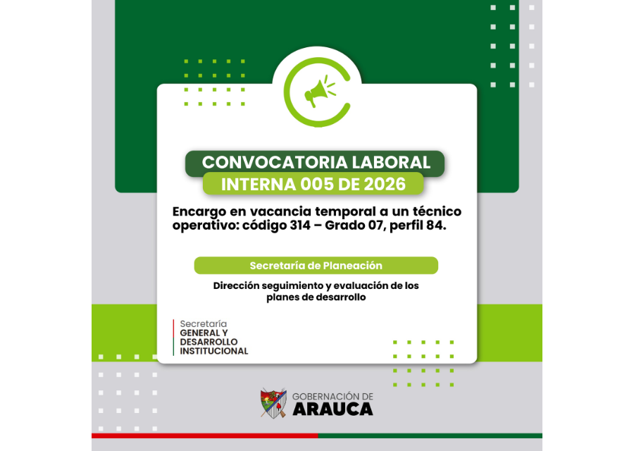 La Secretaría General y Desarrollo Institucional de la Gobernación de Arauca anuncia la Convocatoria Interna No. 005 de 2026, dirigida a los servidores públicos inscritos en Carrera Administrativa o que hayan superado el periodo de prueba. Esta convocatoria busca proveer un (1) empleo por encargo en vacancia temporal en la Secretaría de Planeación – Dirección Seguimiento y Evaluación de los Planes de Desarrollo.