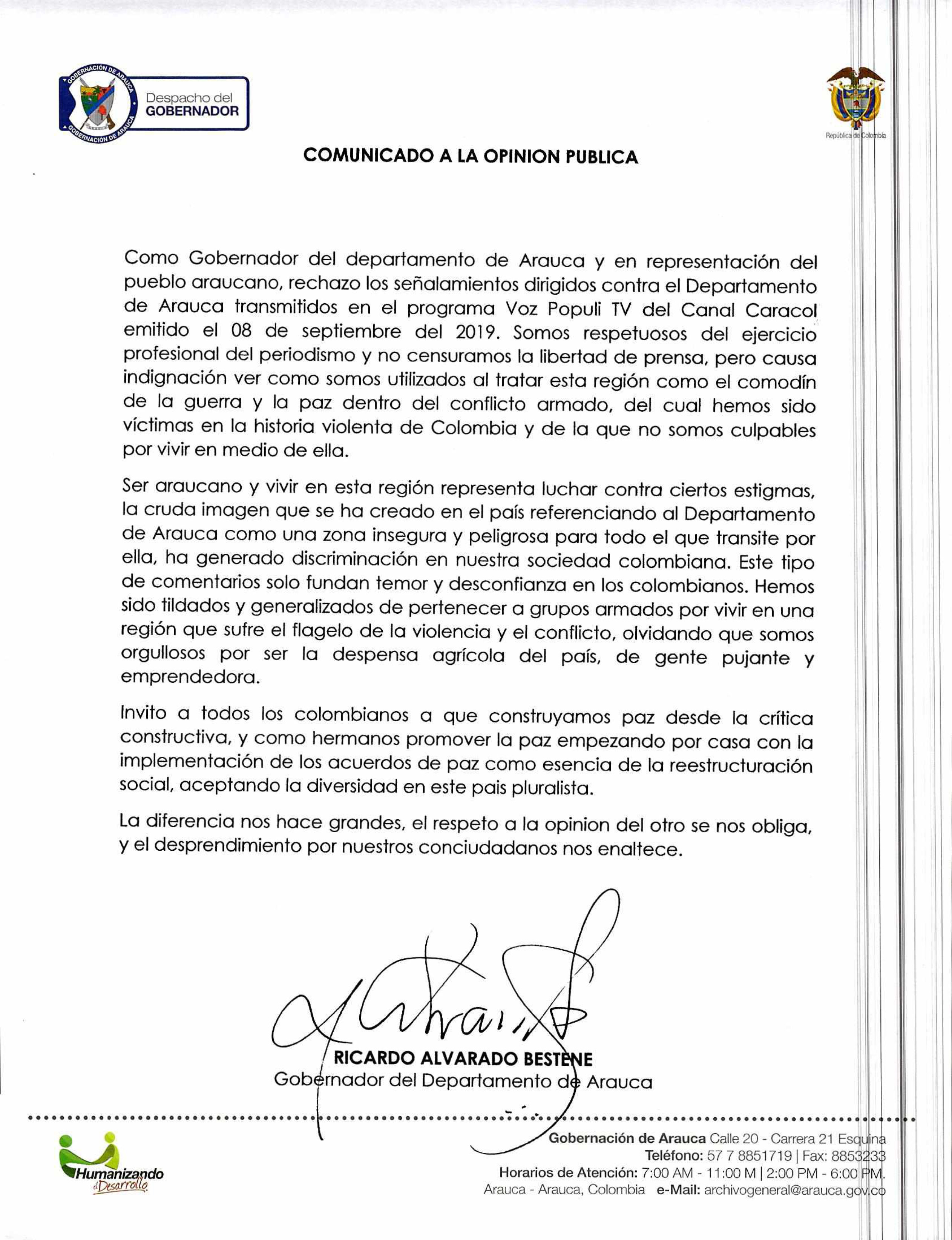 Como Gobernador del departamento de Arauca y en representación del pueblo araucano, rechazo los señalamientos dirigidos contra el Departamento de Arauca transmitidos en el programa Voz Populi TV del Canal Caracol emitido el 08 de septiembre del 2019. Somos respetuosos del ejercicio profesional del periodismo y no censuramos la libertad de prensa, pero causa indignación ver como somos utilizados al tratar esta región como el comodín de la guerra y la paz dentro del conflicto armado, del cual hemos sido víctimas en la historia violenta de Colombia y de la que no somos culpables por vivir en medio de ella.