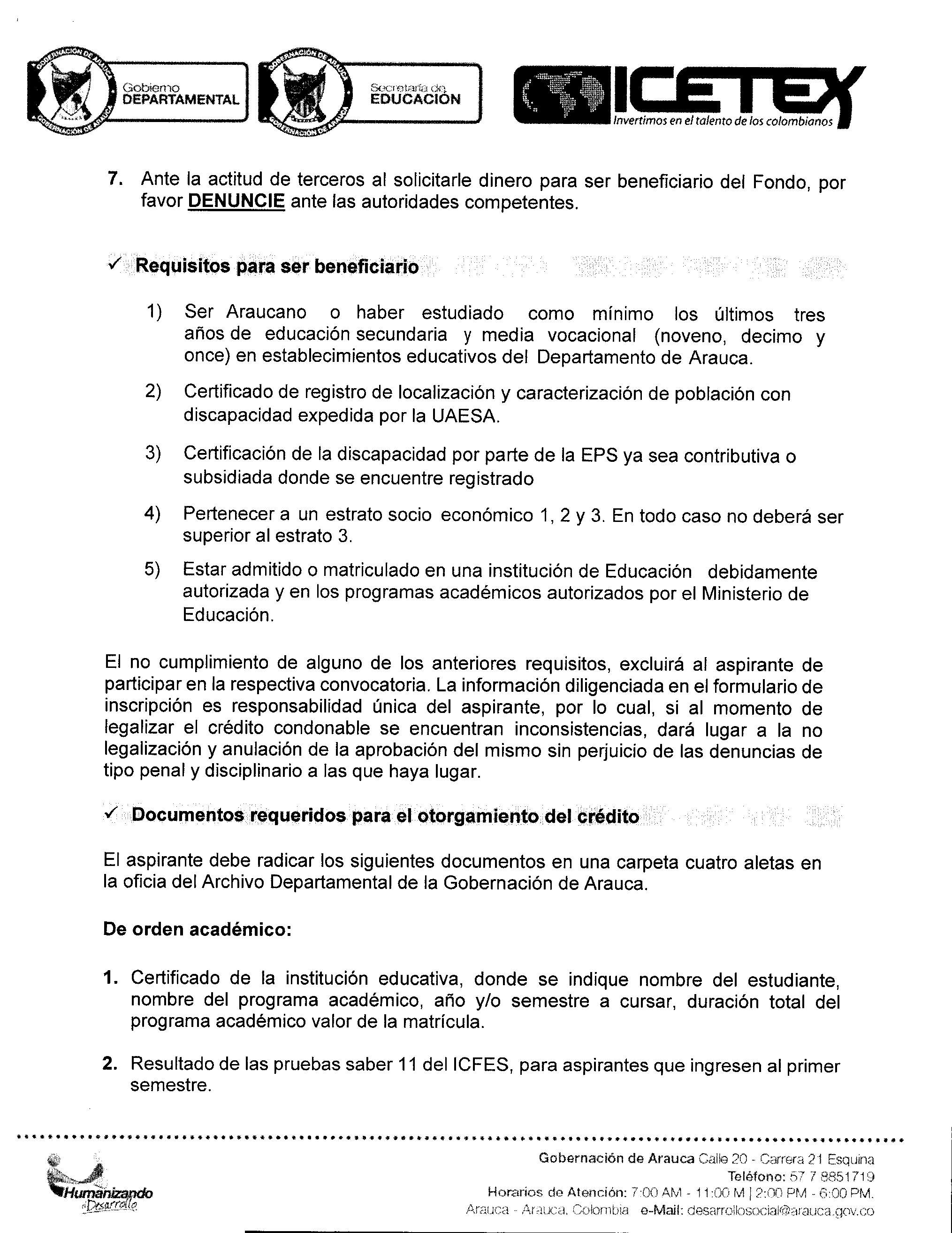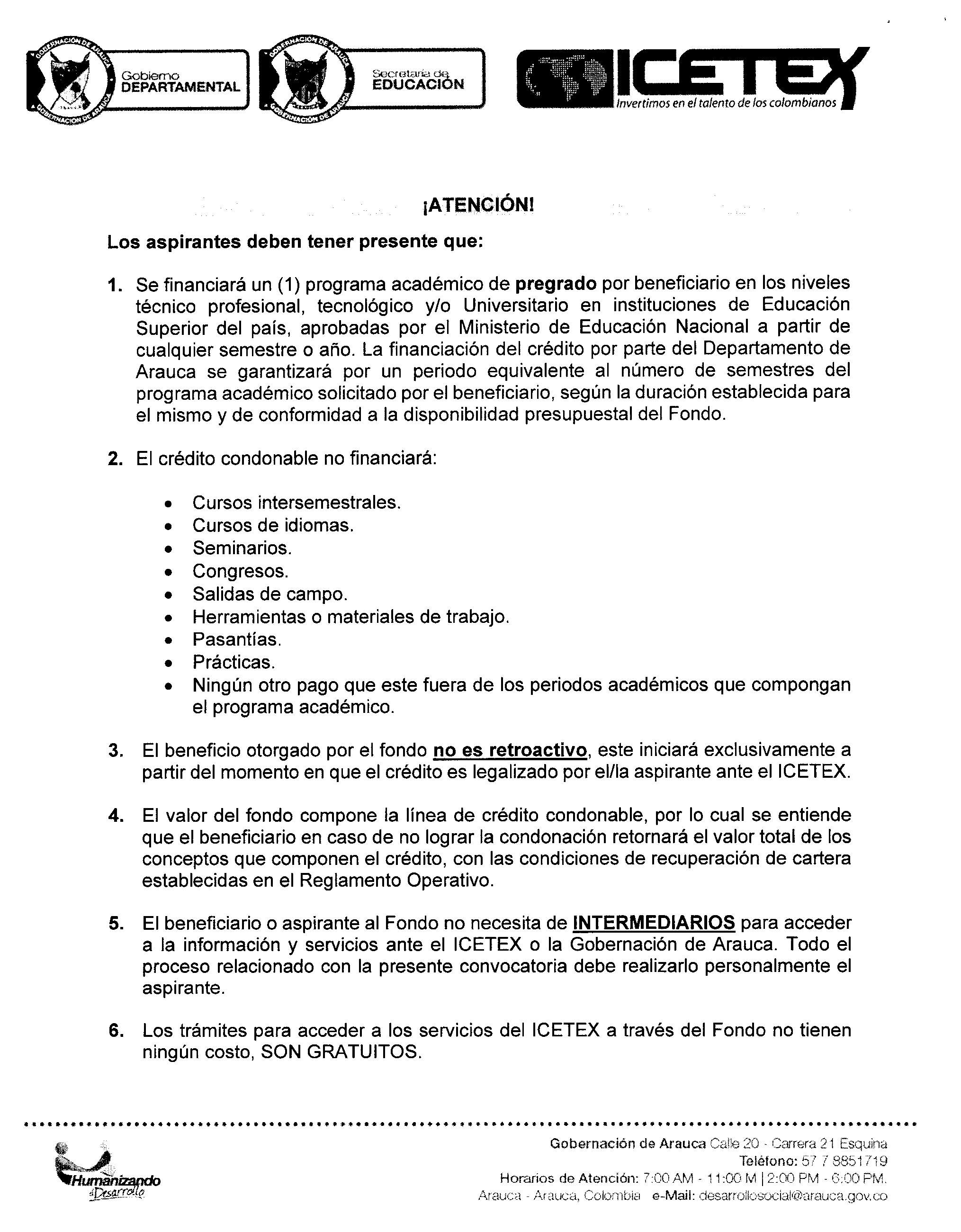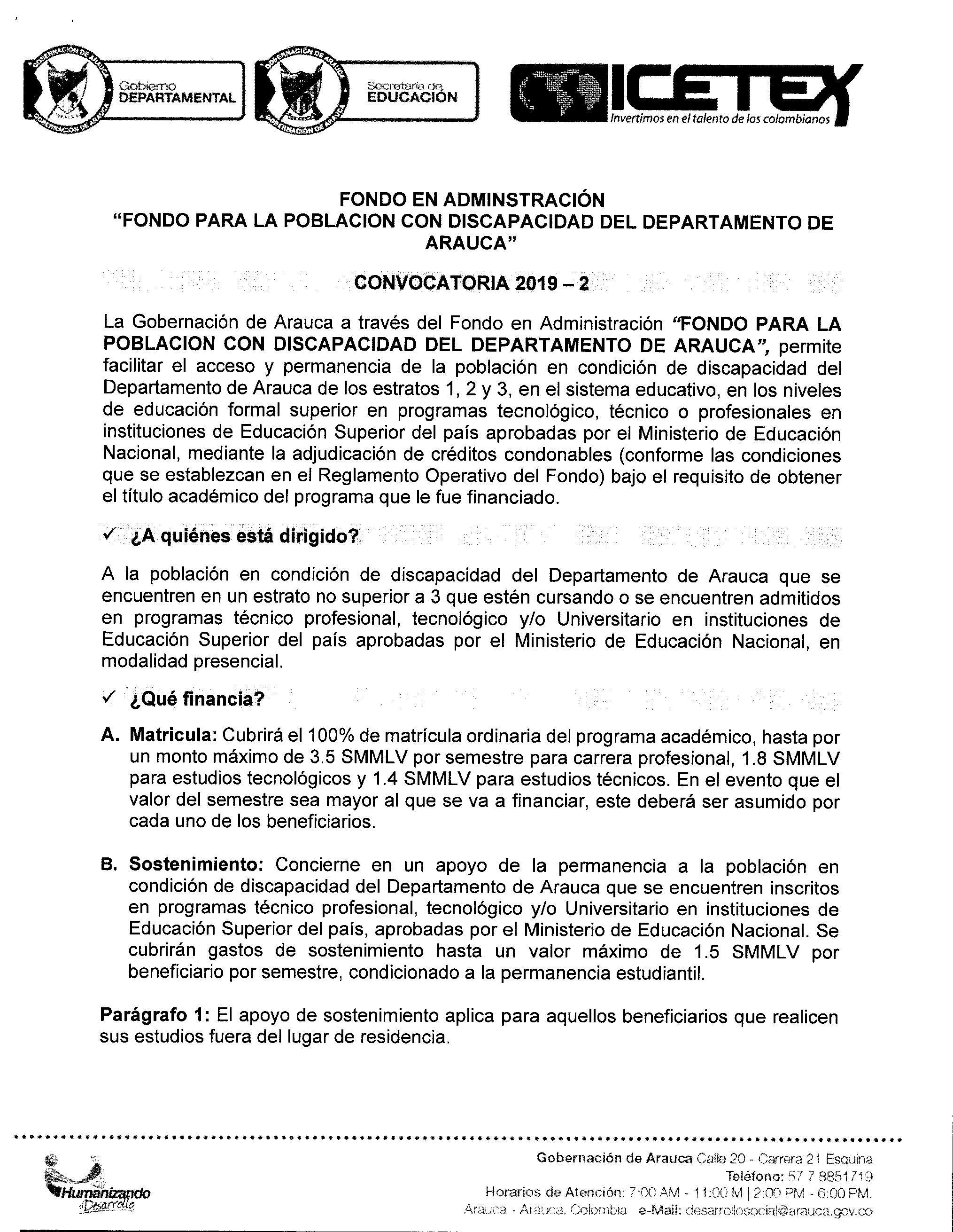 Es importante señalar que la convocatoria tiene por objetivo la ADJUDICACION DE CRÉDITOS CONDONABLES en programas académicos de nivel técnico, tecnológicos y profesional y la misma se encuentra dirigida a personas con discapacidad del Departamento de Arauca.