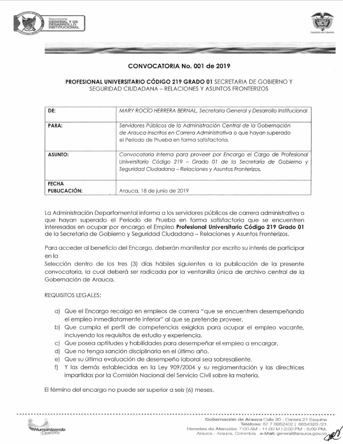 La Gobernación de Arauca por medio de la Secretarpia General y Desarrollo Insitucional se permite abrir Convocatoria N° 001 de 2019 para el cargo de Profesional Universitario código 219 grado 01 de la Secretaría de Gobierno y Seguridad Ciudadana - Relaciones y Asuntos Fronterizos, para los funcionarios públicos de carrera administrativa o que hayan superado el periodo de prueba en forma satisfactoria que se encuentren interesados en ocupar por Encargo dicho puesto, para lo cual debe cumplir algunos requisitos, especificados en el documento.
