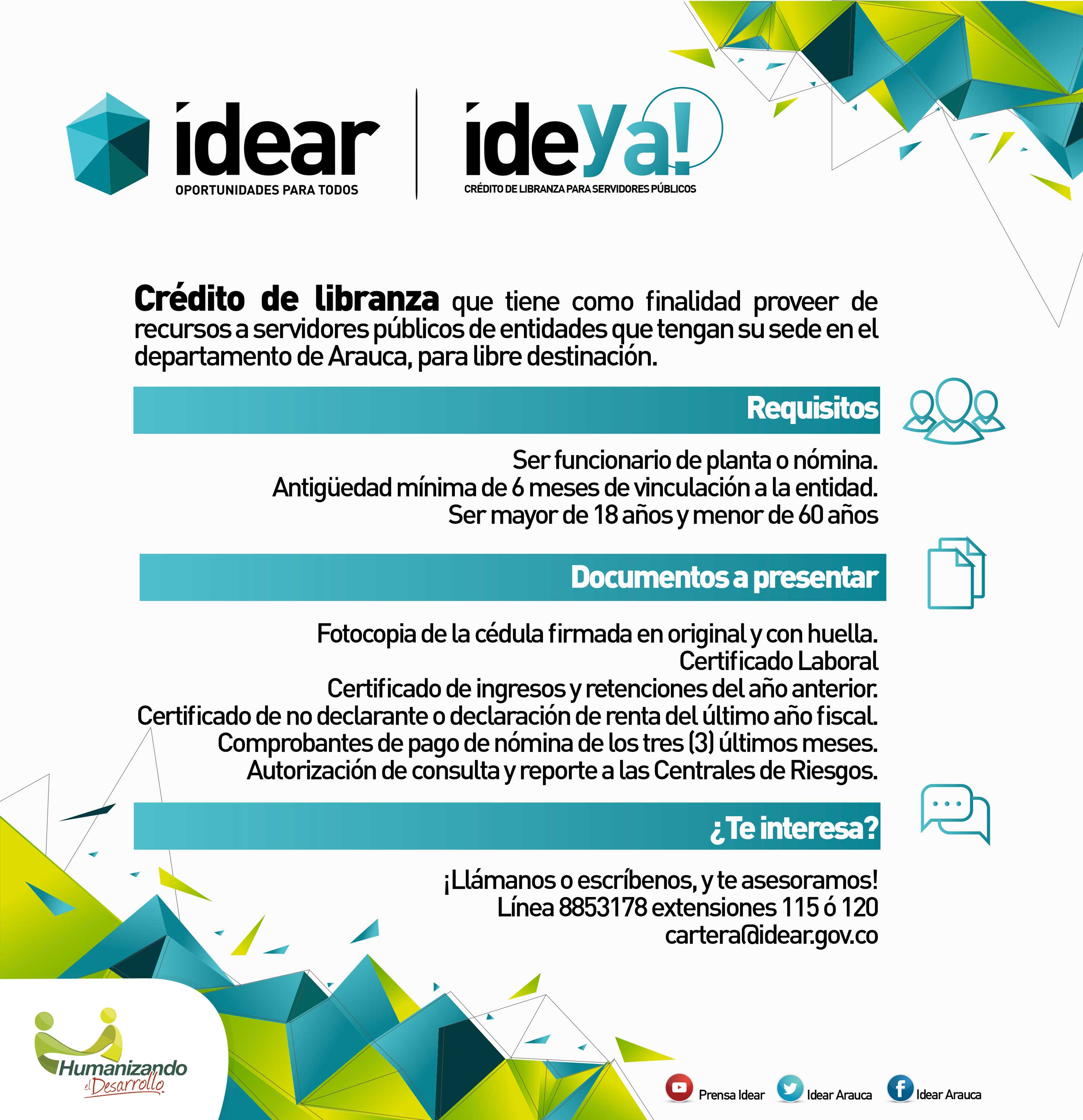 Si está interesado presente su solicitud de libranza en cualquier sede del Instituto o en línea a través de www.idear.gov.co en la plataforma de Solicitudes de Becas y Créditos, SBC.