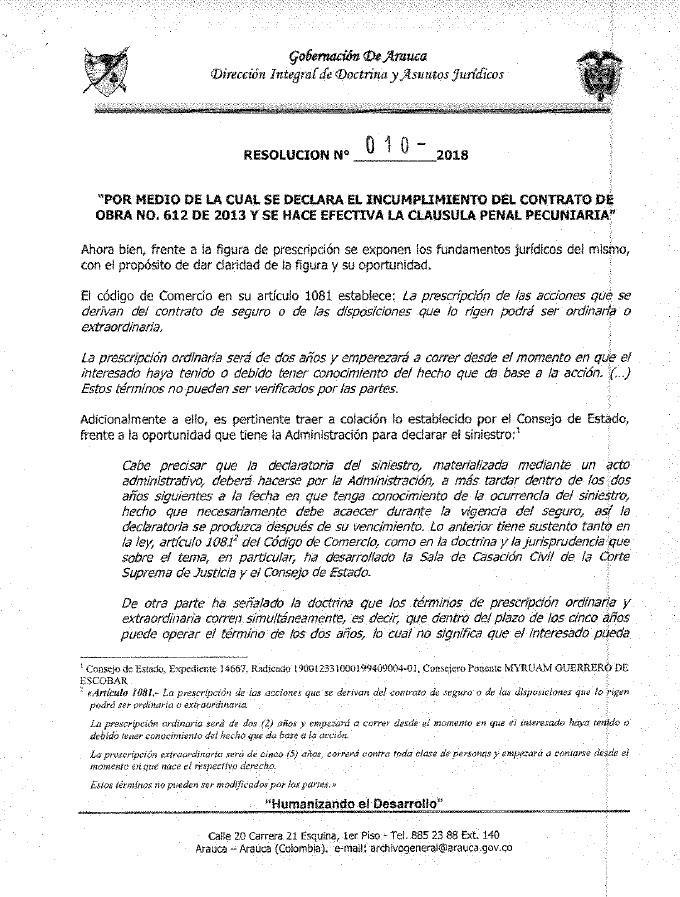 #NotificaciónPorAviso | Sirvase comparecer dentro de los cinco (5) dias siguientes al envío de la presente comunicación, a diligencia de notificación personal, en la Secretaría de Infraestructura Física del Departamento de Arauca, ubicado en la calle 20 con carrera 21 esquina, piso 2° del edificio de la Gobernación de Arauca, en la ciudad de Arauca, dentro del siguiente horario: Días habiles Lunes a Viernes de 08:00 am a 12:00 pm y de 02:00 pm a 05:00 pm, con el fin de notificarse personalmente de la Resolución N° 010 de 15 de enero de 2018.