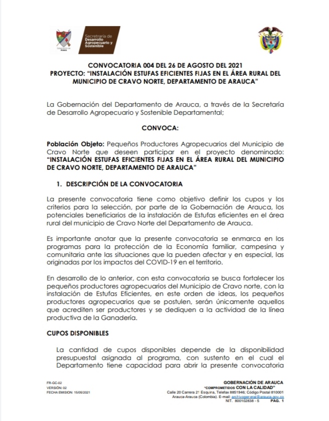 Convocatoria 004 del 26 de Agosto de 2021 del Proyecto:“INSTALACIÓN ESTUFAS EFICIENTES FIJAS EN EL ÁREA RURAL DEL MUNICIPIO DE CRAVO NORTE, DEPARTAMENTO DE ARAUCA”.