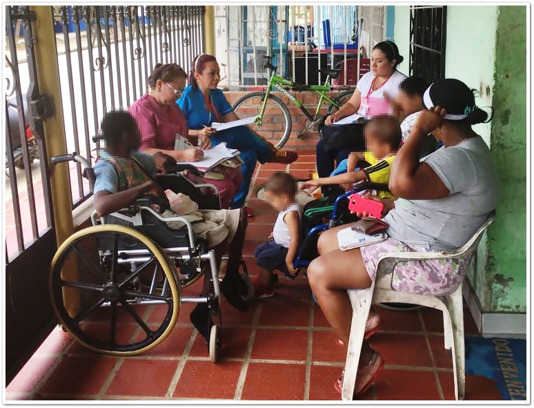El primer componente está dirigido a la rehabilitación basada en comunidad, RBC, lo anterior hace referencia a tres visitas domiciliarias con el acompañamiento de auxiliar de enfermería, fisioterapeuta, terapia ocupacional y psicólogo, el público elegido son familias con personas con discapacidad, se tiene estimado beneficiar a 165 hogares.