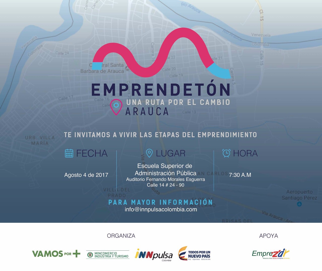 Bajo el lema “Una ruta por el cambio”, la ‘Emprendetón’ -una iniciativa de iNNpulsa Colombia y el Ministerio de Comercio Industria y Turismo (MinCIT)- llega a Arauca. Durante 8 horas los emprendedores de Arauca experimentarán un taller creativo, en el que a partir de retos reales de la región, vivirán las etapas del emprendimiento, generarán soluciones que pueden ser concretadas en oportunidades de negocio en el futuro y competirán por convencer a un jurado que simulará ser un pool de potenciales inversionistas. Esta es la tercera ciudad a la que llega la iniciativa nacional que fue lanzada en Popayán el pasado 22 de junio, con una participación de 200 personas, y que posteriormente fue a Manizales. La ruta nacional también incluirá a Valledupar, Villavicencio, Sincelejo, Puerto Inírida y Leticia.