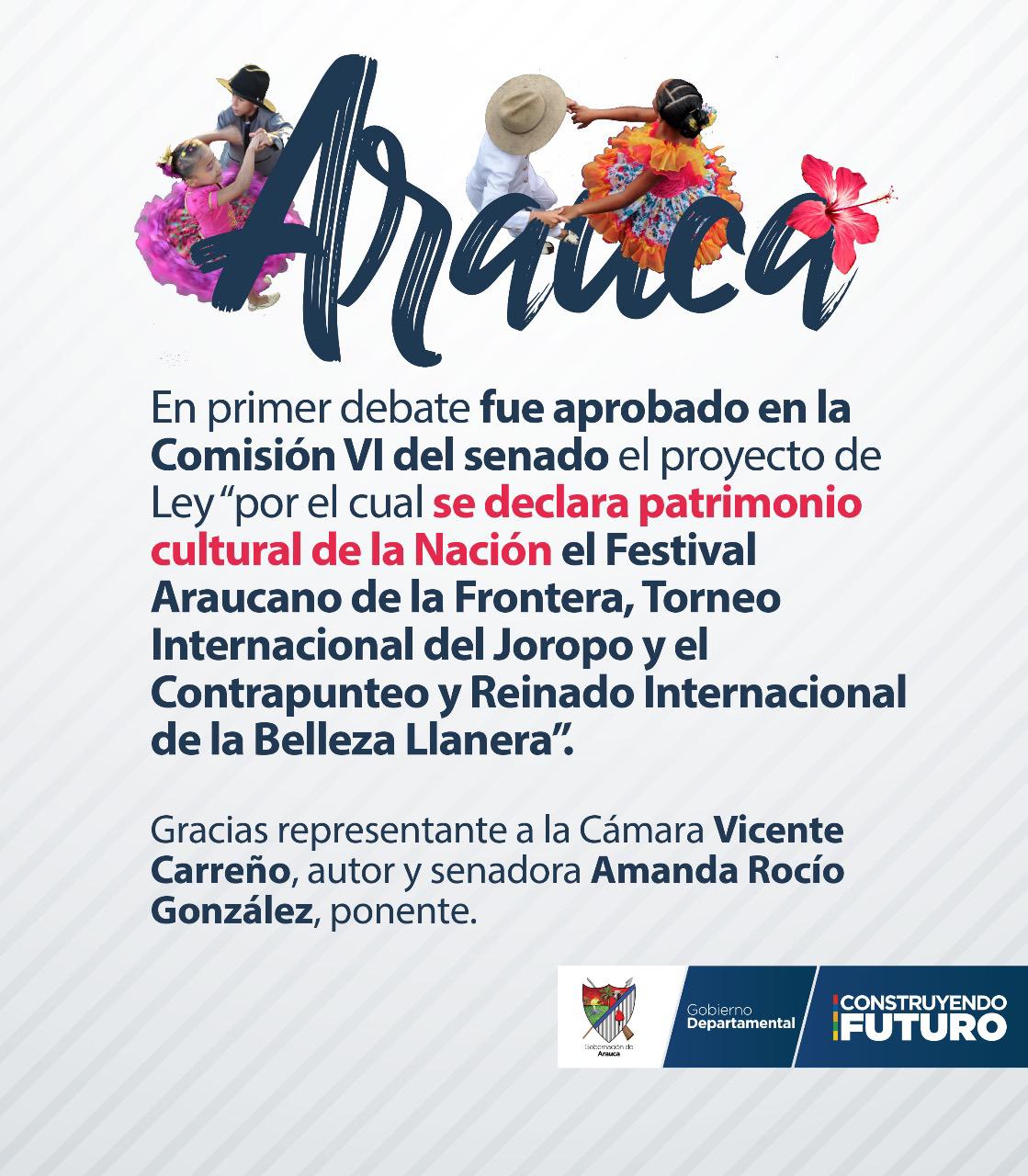 Por unanimidad, la Comisión Sexta del Senado, aprobó la ponencia de la senadora Amanda Rocío Gonzálezal Proyecto de Ley para declarar Patrimonio Cultural de la Nación el Festival Araucano de la frontera Torneo Internacional del Joropo y el Contrapunteo Reinado Internacional de la Belleza Llanera.