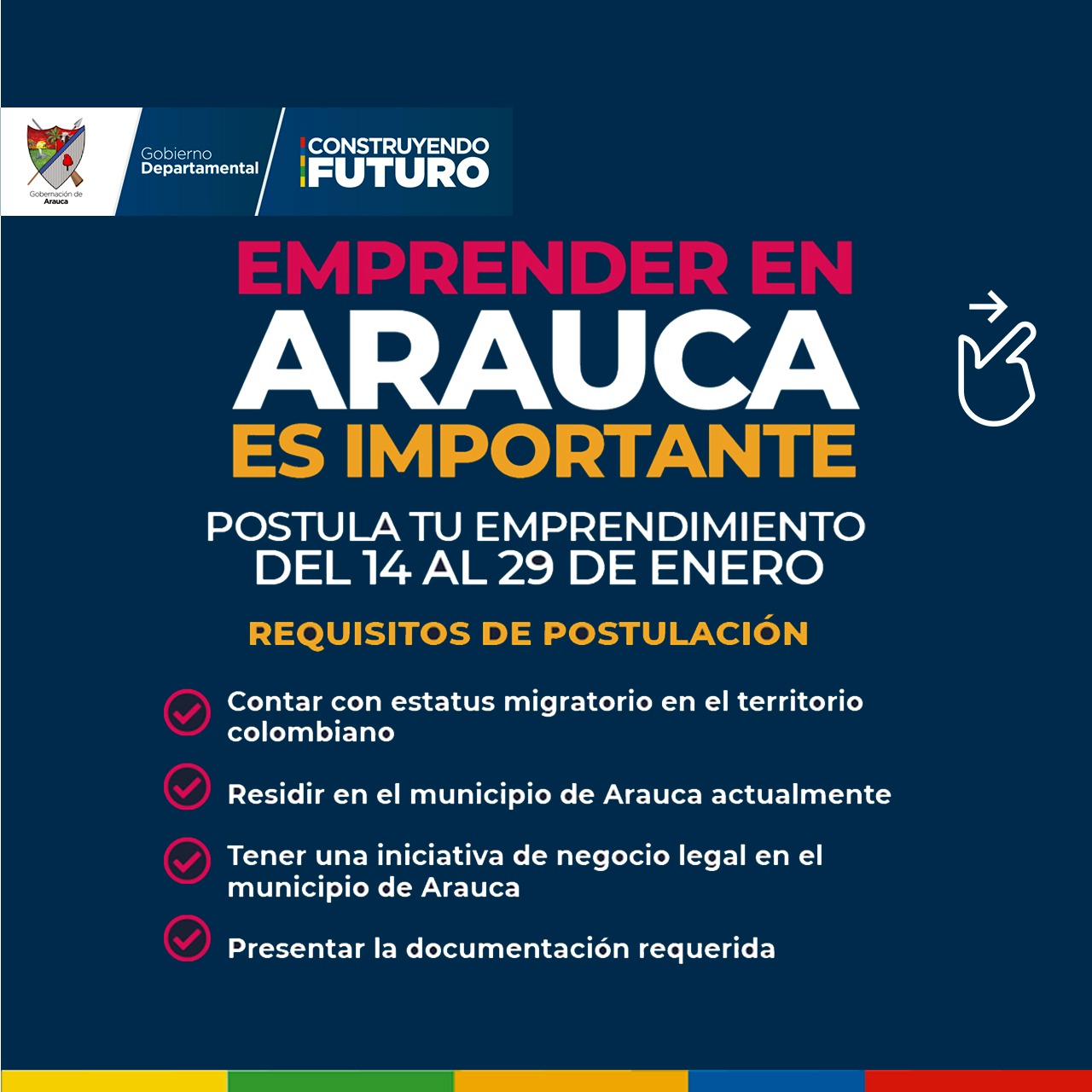 El gobierno departamental abre la convocatoria virtual a partir de este 14 de enero de 2021 para la presentación de propuestas de desarrollo de estrategias de emprendimiento dirigido a la población migrante, refugiados, colombianos retornados y comunidad de acogida del departamento de Arauca.