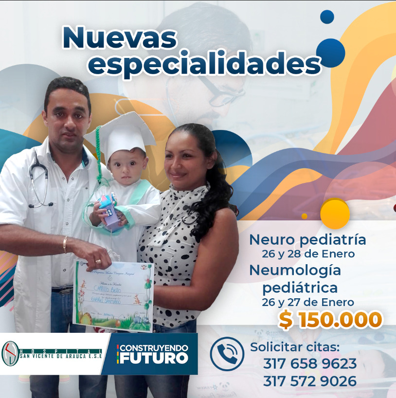 El hospital San Vicente de Arauca continúa su proceso de renovación e implementación de nuevos servicios; esta vez incorpora dos nuevas especialidades como son: neumología pediátrica y neuropediatría las cuales se iniciarán el próximo martes 26 de enero.