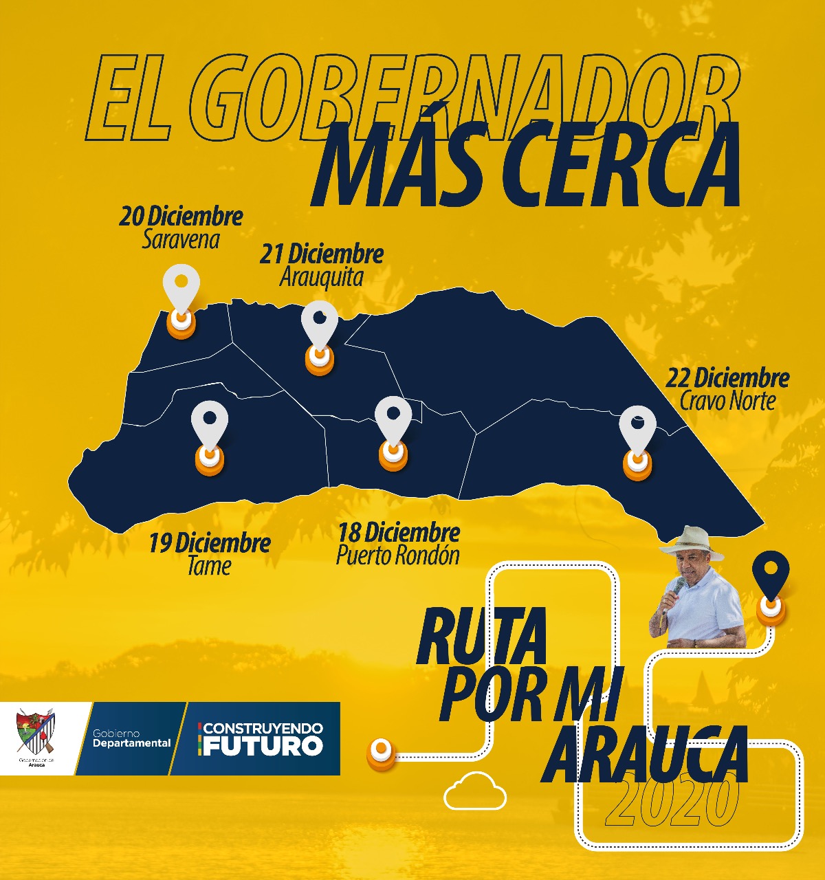 El domingo estará en el municipio de Saravena, allí entregará las mejoras y dotación realizada al Centro del Adulto Mayor, el lunes 21 llegará a Arauquita y estará en la rendición de cuentas del alcalde Etelivar Torres y culmina el martes en el municipio de Cravo Norte donde socializará importantes proyectos que se ejecutarán en esa localidad en el 2021.