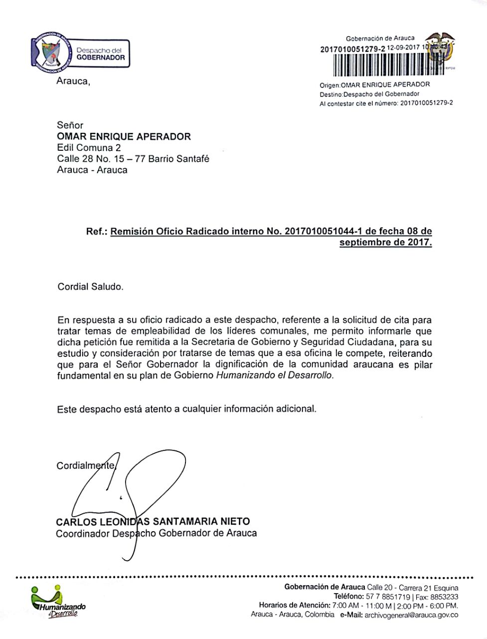 Luego de enviar la respuesta al oficio radicado N° 2017010051044-1 de fecha 08 de septiembre de 2017 y no poder hacer entrega personal al señor OMAR ENRIQUE APERADOR, se hace pública la respuesta.