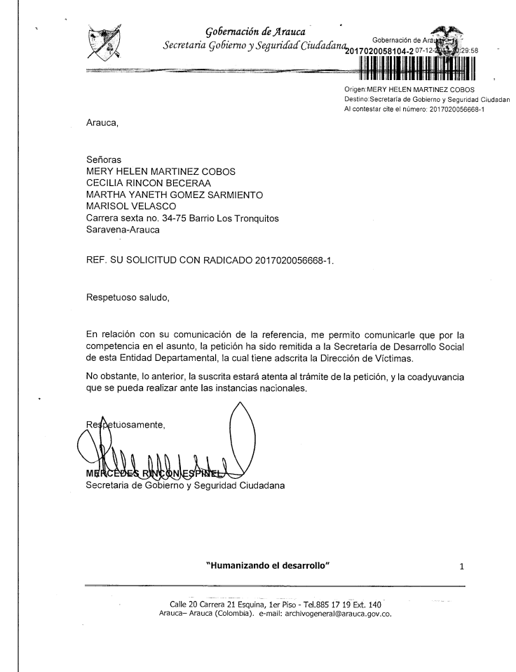#NotificaciónPorAviso | La Gobernación de Arauca por medio de la secretaría de Gobierno y Seguridad Ciudadana se permite notificar a la señora MERY HELEN MARTINEZ COBOS, de la resupuesta a la solicitud con radicado N° 2017020056668-1 del 20 de noviembre de 2017, lo anterior dada la imposibilidad de notificar personalmente a la señora Martinez Cobo.