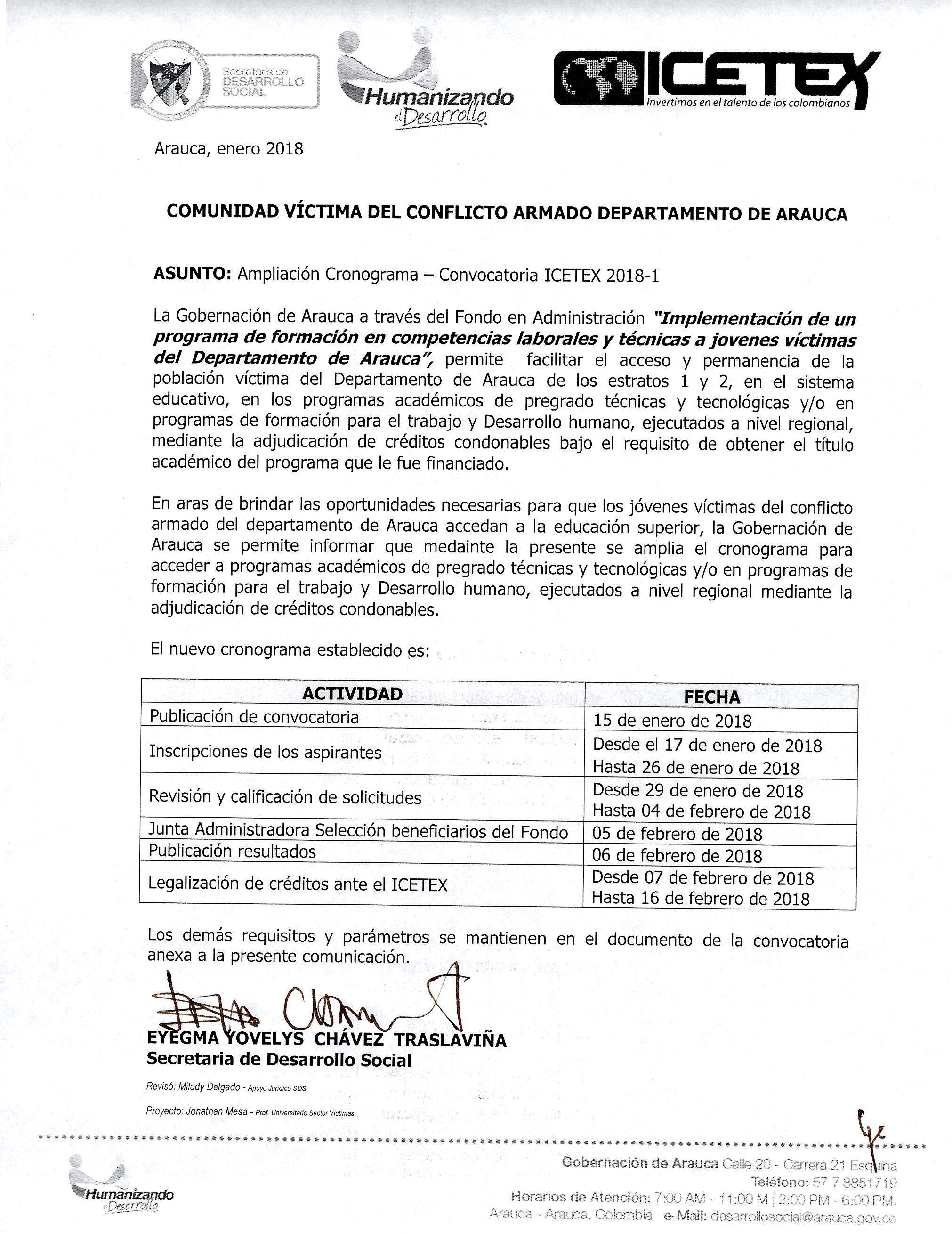 El Gobernador de Arauca Ricardo Alvarado Bestene, a través de la Secretaria de Desarrollo Social Eyegma Chávez Traslaviña continúa su labor en pro de la población víctima del conflicto armado del Departamento de Arauca. En esta oportunidad se presenta la ampliación del cronograma de la convocatoria 2018-1 para que los jóvenes víctimas del conflicto armado del Departamento de Arauca tengan acceso y permanencia en el sistema educativo, en los programas académicos de pregrado Técnicas y Tecnológicas y/o en programas de Formación para el Trabajo y Desarrollo Humano a nivel regional, mediante la adjudicación de créditos condonables a través del FONDO EN ADMINSTRACIÓN “IMPLEMENTACIÓN DE UN PROGRAMA DE FORMACIÓN EN COMPETENCIAS LABORALES Y TÉCNICAS A JOVENES VÍCTIMAS DEL DEPARTAMENTO DE ARAUCA” suscrito entre la Gobernación de Arauca y el Instituto Colombiano de Crédito Educativo y Estudios Técnicos en el Exterior – ICETEX.