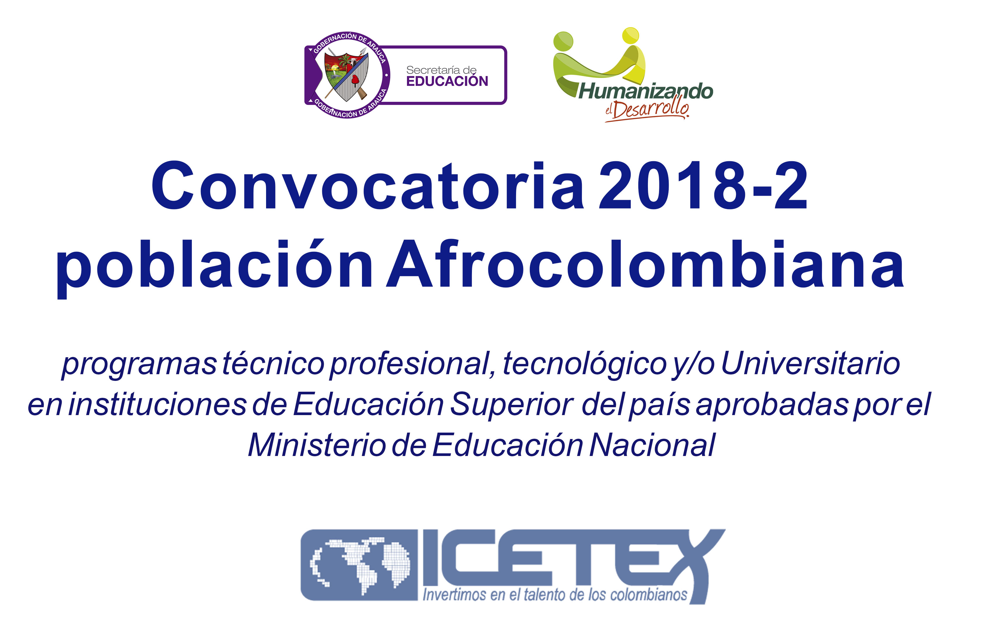 #ConvocatoriaPoblaciònAfro El Gobernador de Arauca Ricardo Alvarado Bestene, a través de la Secretaria de Educación se permite presentar la convocatoria 2018-2 para que la Población Afrocolombiana del Departamento de Arauca tengan acceso y permanencia en el sistema educativo, en los programas técnico profesional, tecnológico y/o Universitario en instituciones de Educación Superior del país aprobadas por el Ministerio de Educación Nacional, mediante la adjudicación de créditos condonables a través del “FONDO PARA LA POBLACION AFROCOLOMBIANA DEL DEPARTAMENTO DE ARAUCA” suscrito entre la Gobernación de Arauca y el Instituto Colombiano de Crédito Educativo y Estudios Técnicos en el Exterior – ICETEX.
