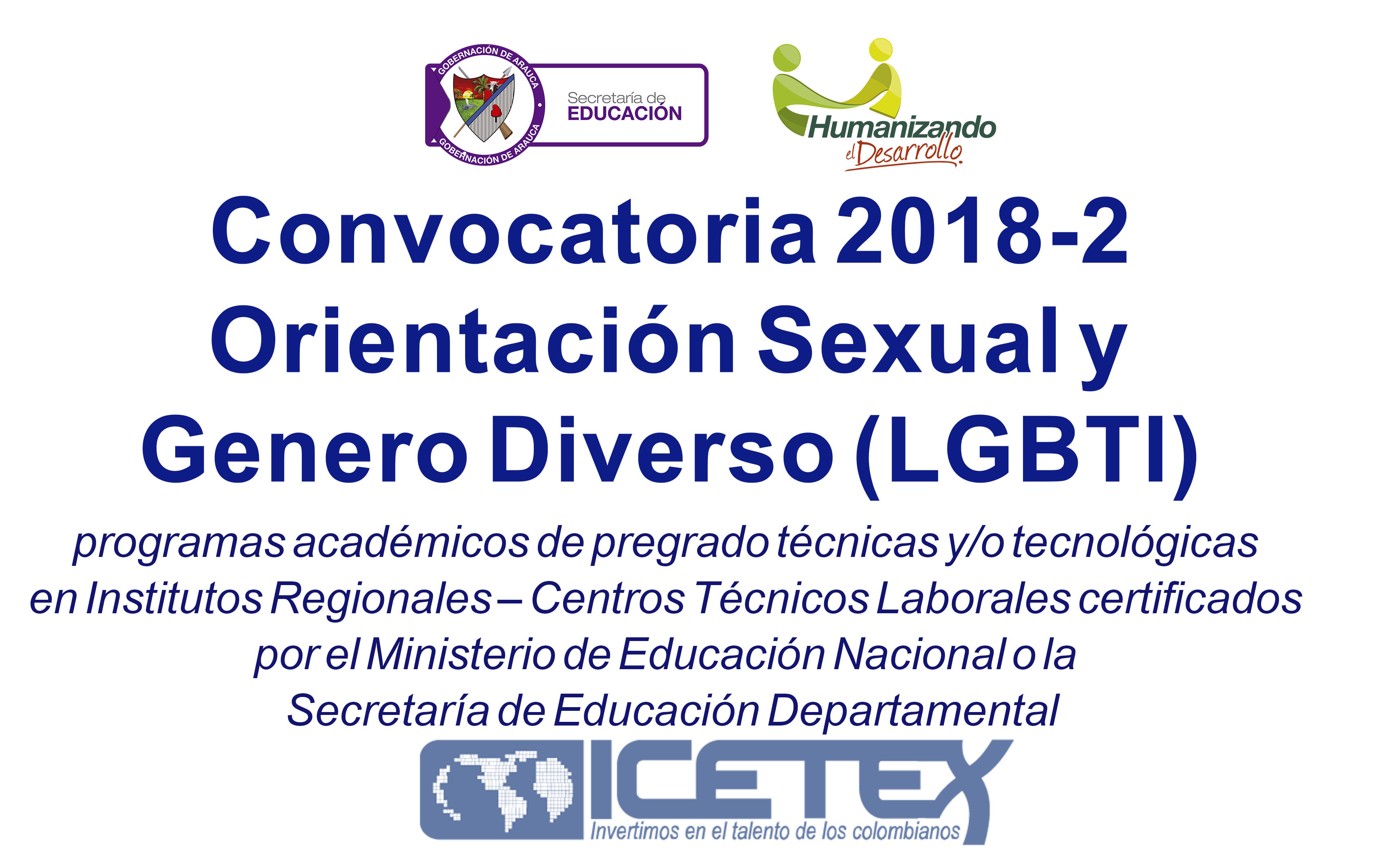 #ConvocatoriaPoblaciònLGBTI El Gobernador de Arauca Ricardo Alvarado Bestene, a través de la Secretaria de Desarrollo Social Eyegma Chávez Traslaviña se permite presentar la convocatoria 2018-2 para que la Poblaciòn con Orientaciòn Sexual y Genero Diverso (LGBTI) del Departamento de Arauca tengan acceso y permanencia en el sistema educativo, en los programas académicos de pregrado técnicas y/o tecnológicas en Institutos Regionales – Centros Técnicos Laborales certificados por el Ministerio de Educación Nacional o la Secretaría de Educación Departamental, mediante la adjudicación de créditos condonables a través del “FONDO PARA LA POBLACIÓN CON ORIENTACIÓN SEXUAL DIVERSA DEL DEPARTAMENTO DE ARAUCA” suscrito entre la Gobernación de Arauca y el Instituto Colombiano de Crédito Educativo y Estudios Técnicos en el Exterior – ICETEX.