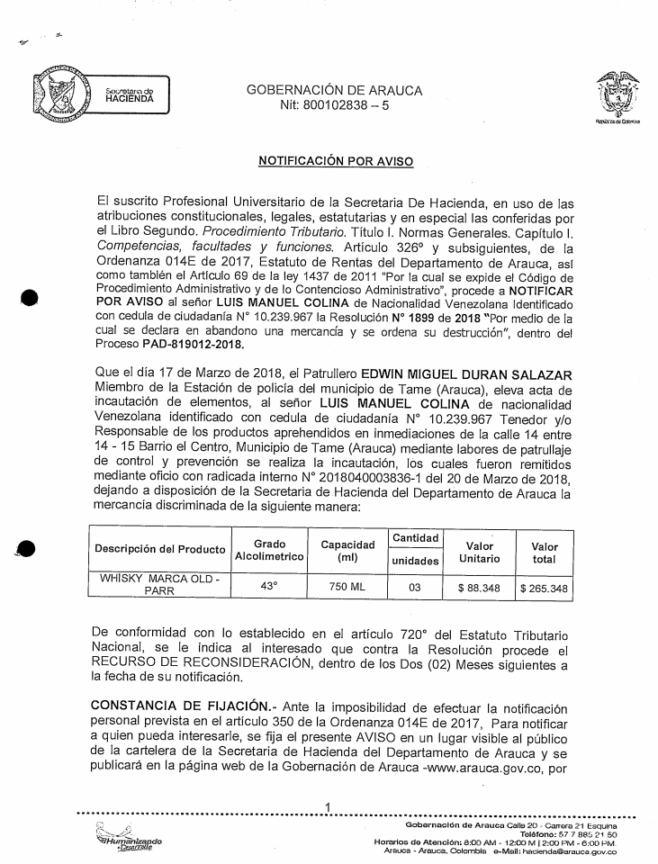 #NotificaciónPorAviso | Ante la imposibilidad de efectuar la notificación personal prevista en el artículo 342 de la Ordenanza 007E de 2013, Para notificar a quien pueda interesarle, se fija el presente Aviso en lugares visibles de la Gobernación, su pagina web y redes sociales. Resolución N° 1899 de 2018 de declaración de abandono y decomiso de mercancías, donde también se ordena su destrucción.