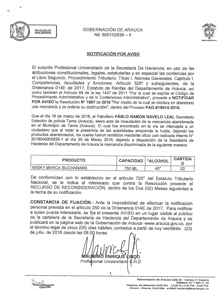 #NotificaciónPorAviso | Ante la imposibilidad de efectuar la notificación personal prevista en el artículo 342 de la Ordenanza 007E de 2013, Para notificar a quien pueda interesarle, se fija el presente Aviso en lugares visibles de la Gobernación, su pagina web y redes sociales. Resolución N° 1897 de 2018 de declaración de abandono y decomiso de mercancías, donde también se ordena su destrucción.