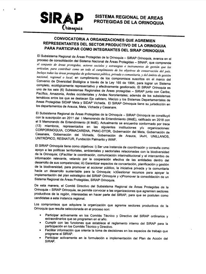 #Convocatoria | Participe en convocatoria a organizaciones que agremien representantes del sector productivo de la Orinoquia para participar como integrantes del SIRAP Orinoquia. Para más información comunicarse al correo Esta dirección de correo electrónico está siendo protegida contra los robots de spam. Necesita tener JavaScript habilitado para poder verlo.