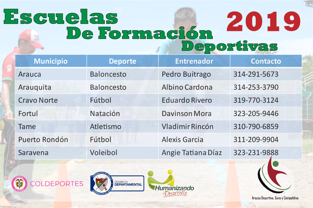 Los padres de familia que estén interesados en que sus hijos hagan parte de las escuelas, pueden comunicarse al número celular 310-598-7224 ahí se les brindara toda la información. Este programa de Coldeportes Arauca es apoyado por el gobernador Ricardo Alvarado Bestene.
