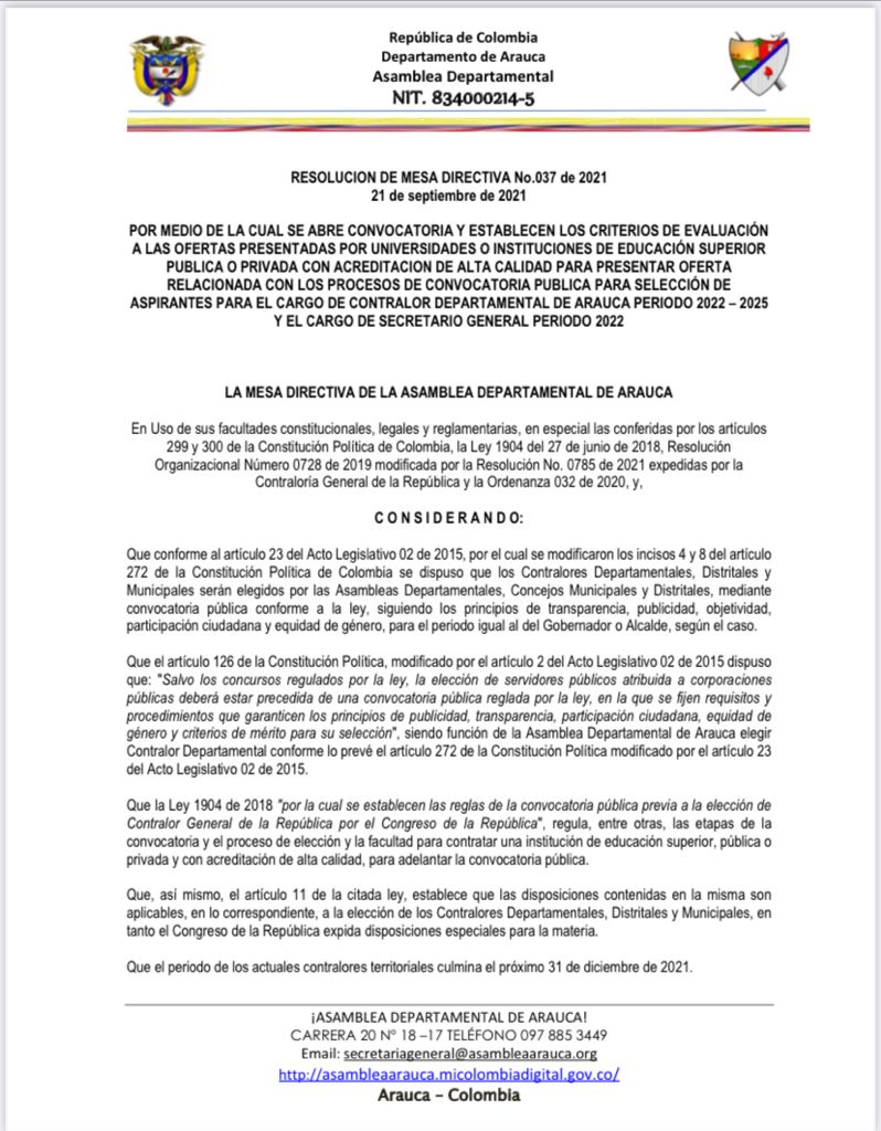 Asamblea Departamental de Arauca da apertura a la convocatoria y establece los criterios de evaluación a las ofertas presentadas por universidades o instituciones de educación superior público privada con acreditaciones de alta calidad para presentar oferta relacionada con los procesos de convocatoria pública para selección de aspirantes para el cargo de Contralor Departamental de Arauca periodo 2022-2025 y el cargo de secretario general de la Asamblea periodo 2022.