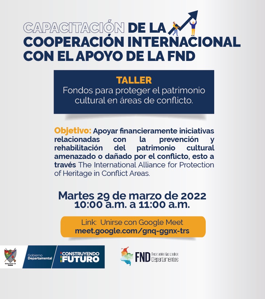 Gestores y Creadores Culturales, participen de la capacitación que ofrece la FND - Federación Nacional de Departamentos y la Cooperación International Alliance for Protection of Heritage in Conflict Areas, con el apoyo de la Casa Fiscal de Arauca en la ciudad de Bogotá.
