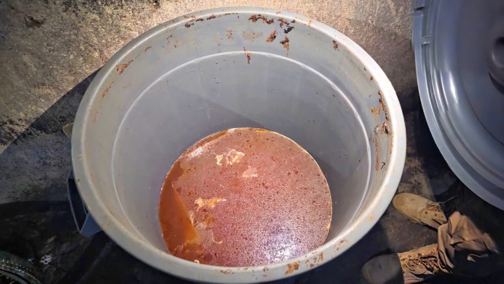 Barril de plástico con bebida artesanal adulterada sin asepsia, mezclada con licores como vokda y ron