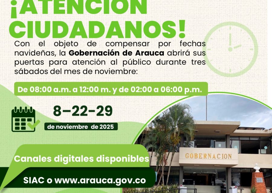 La Gobernación de Arauca reafirma su compromiso con el bienestar y la atención cercana a sus ciudadanos, extendiendo su servicio presencial durante tres sábados del mes de noviembre. Esta iniciativa busca facilitar a la comunidad la realización de sus trámites administrativos en horario completo, atendiendo sus necesidades con calidad y oportunidad.