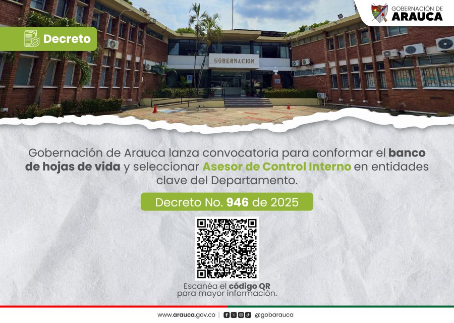 La Gobernación de Arauca acaba de emitir el Decreto No. 946 de 2025, una nueva invitación pública dirigida a profesionales que deseen formar parte del banco de hojas de vida para proveer el cargo estratégico de Asesor de Control Interno en la Gobernación y en sus entidades descentralizadas, incluyendo el Instituto Departamental de Desarrollo de Arauca (IDEAR), la Unidad Administrativa Especial de Salud de Arauca (UAESA), el Hospital San Vicente, el Hospital del Sarare, la E.S.E. Departamental Moreno y Clavijo, y la Empresa de Energía Eléctrica de Arauca (ENELAR E.S.P.).