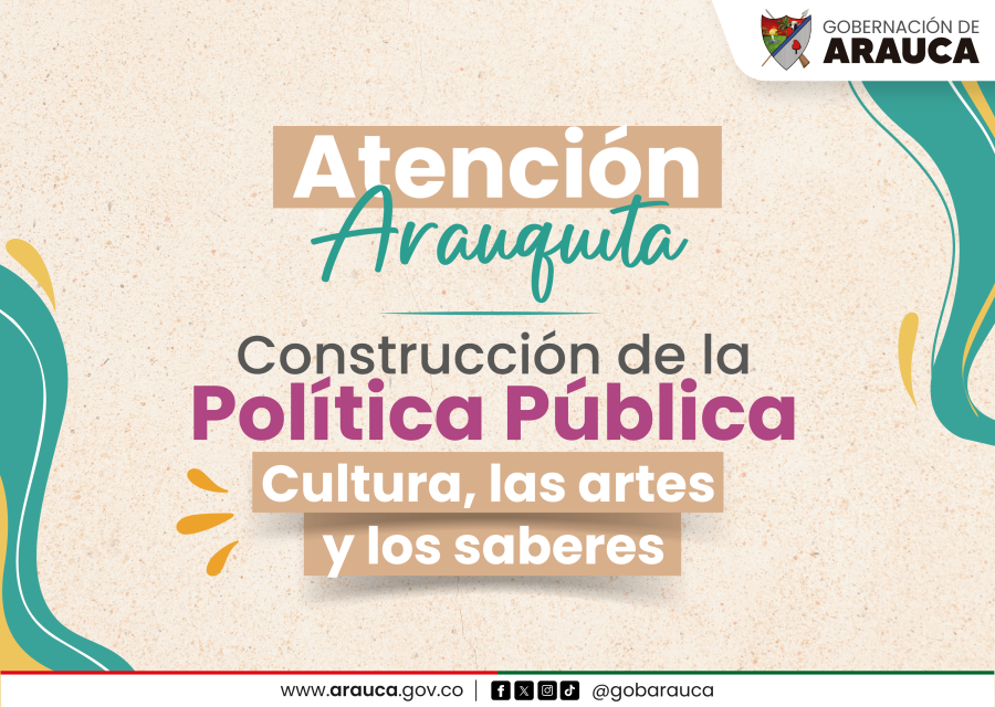 La Gobernación de Arauca, a través de la Oficina Asesora de Cultura y Turismo, invita a los actores culturales, instituciones, colectivos, gestores, artistas, portadores de tradición y ciudadanía en general a participar en las jornadas municipales que se desarrollarán en el marco del proceso de construcción de la Política Pública de Cultura, las Artes y los Saberes 2025–2035.