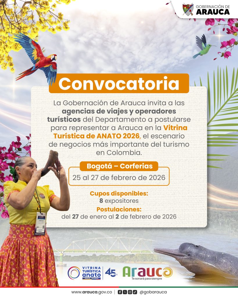 Arauca, 27 de enero de 2026. – La Gobernación de Arauca, a través de la Oficina Asesora de Cultura y Turismo, abrió la convocatoria para la selección de agencias de viajes y operadores turísticos que integrarán la delegación del Departamento en la Vitrina Turística ANATO 2026, el evento más importante del turismo en Colombia, que se realizará del 25 al 27 de febrero en Corferias, Bogotá.