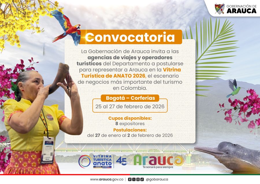 Arauca, 27 de enero de 2026. – La Gobernación de Arauca, a través de la Oficina Asesora de Cultura y Turismo, abrió la convocatoria para la selección de agencias de viajes y operadores turísticos que integrarán la delegación del Departamento en la Vitrina Turística ANATO 2026, el evento más importante del turismo en Colombia, que se realizará del 25 al 27 de febrero en Corferias, Bogotá.