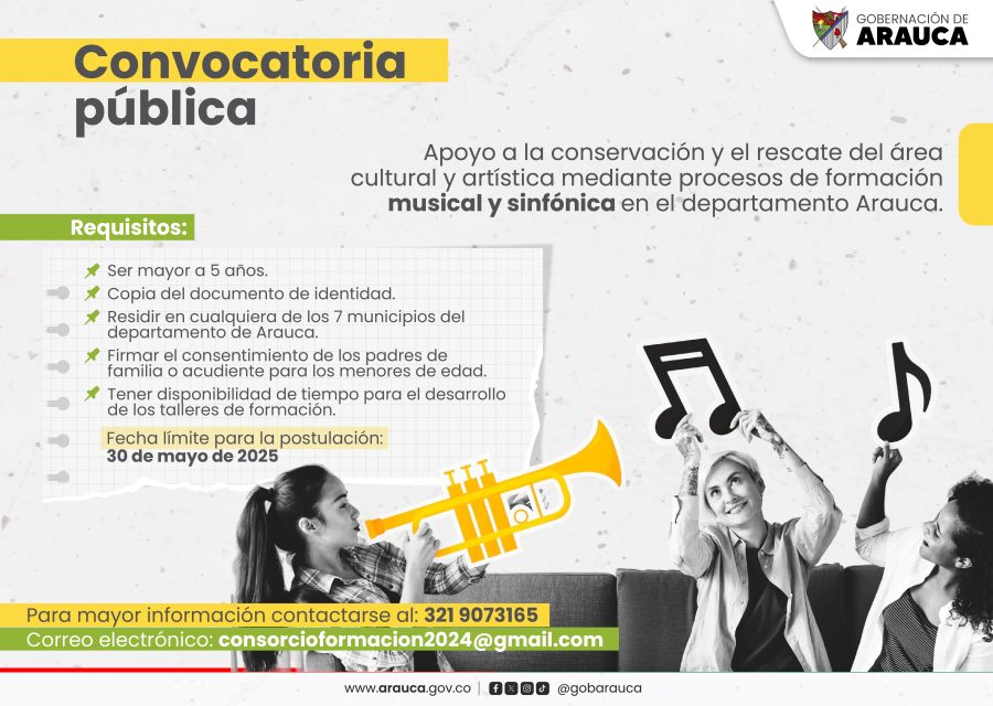 La Gobernación de Arauca, a través de la Oficina Asesora de Cultura y Turismo, invita a niños, niñas, adolescentes, jóvenes y adultos a participar en la convocatoria que estará abierta del 15 al 30 de mayo de 2025, orientada al apoyo, conservación y rescate del área cultural y artística del departamento mediante procesos de formación musical y sinfónica.