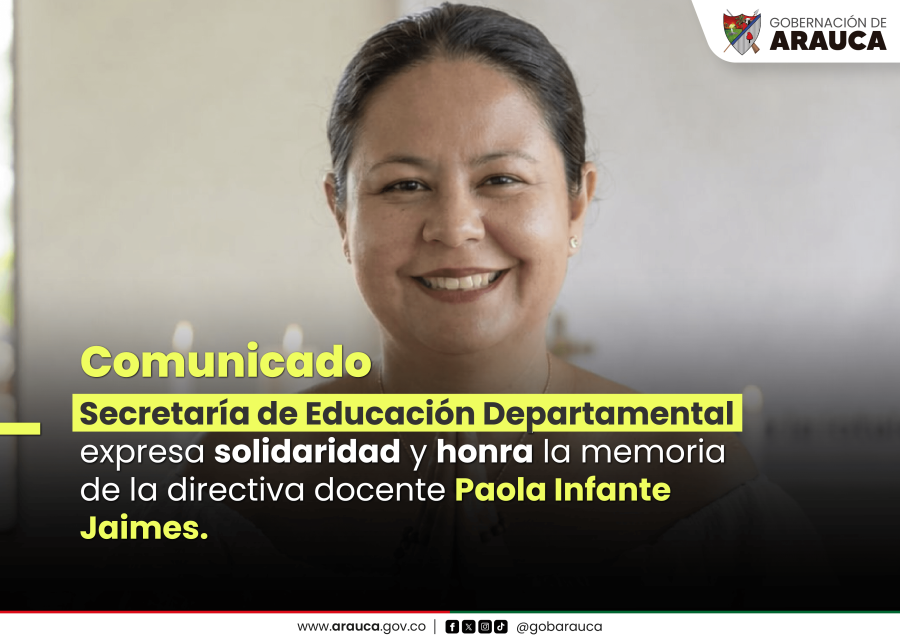 Arauca, 20 de abril de 2026.-Desde la Secretaría de Educación Departamental de Arauca lamentamos profundamente el fallecimiento de la directiva docente Paola Infante Jaimes, quien durante 17 años hizo parte del magisterio araucano, y en los últimos cinco ejerció como directora del Centro Educativo Rural Atanasio Girardot, dedicando su vocación, compromiso y liderazgo a la educación de niñas, niños y jóvenes del municipio de Saravena.